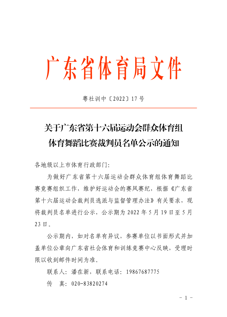 关于广东省第十六届运动会群众体育组体育舞蹈比赛裁判员名单公示的通知 来源: 发布时间:2022-05-19 14:11:48 浏览次数: 次 【字体:小 大】 终审:HYP 点赞 收藏 分享到: 【打印正文】