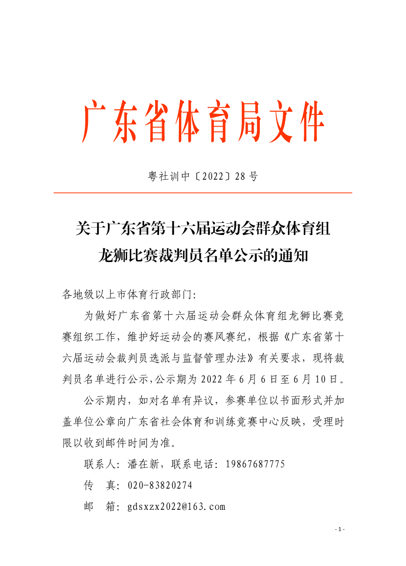 关于广东省第十六届运动会群众体育组龙狮比赛裁判员名单公示的通知 来源: 发布时间:2022-06-06 16:25:55 浏览次数: 次 【字体:小 大】 终审:Admin 点赞 收藏 分享到: 【打印正文】