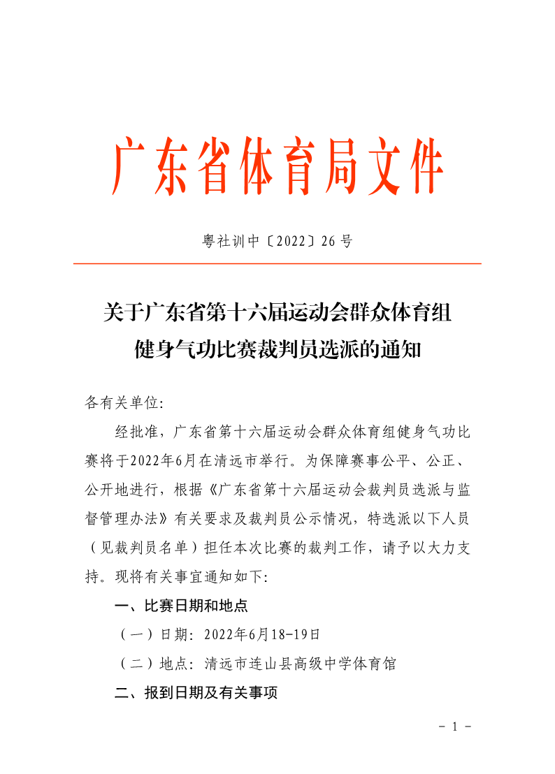 关于广东省第十六届运动会群众体育组健身气功裁判员选派的通知