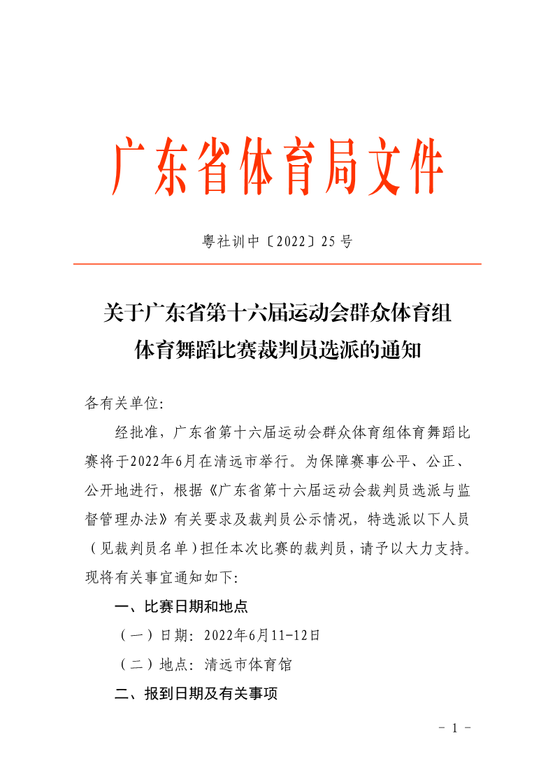 关于广东省第十六届运动会群众体育组体育舞蹈比赛裁判员选派的通知