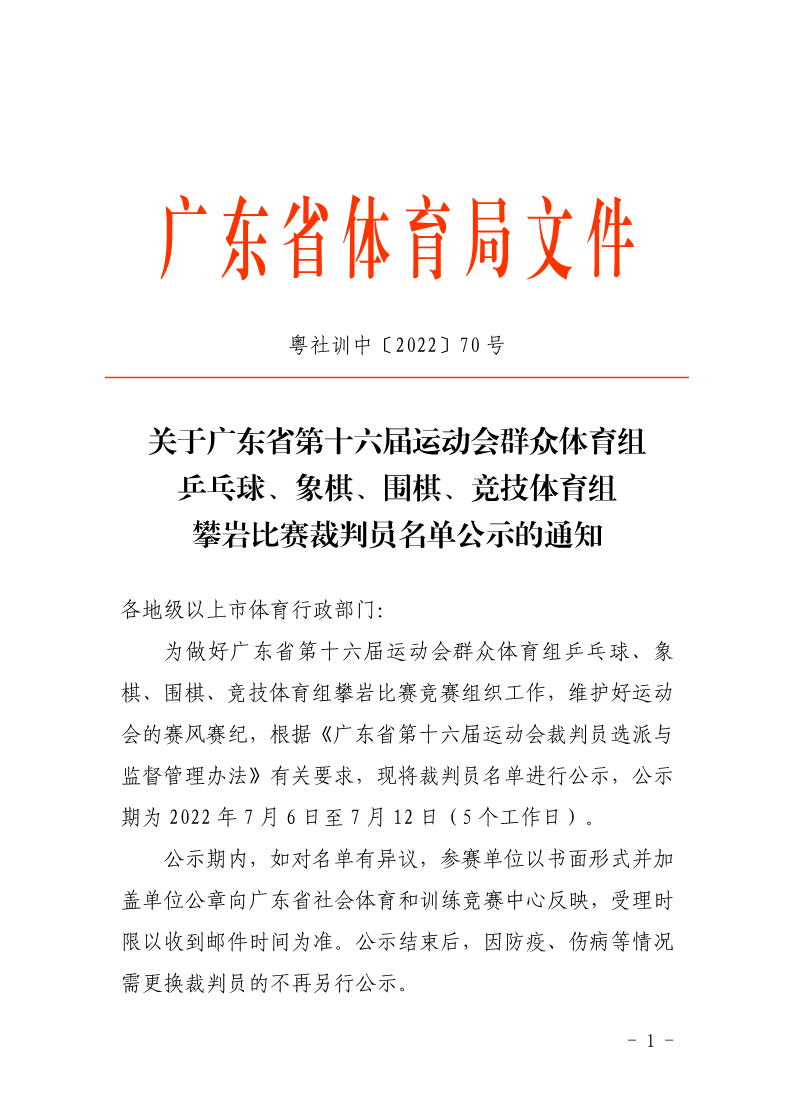关于广东省第十六届运动会群体组乒乓球、象棋、围棋、竞体组攀岩裁判员名单公示的通知 来源: 发布时间:2022-07-06 15:25:33 浏览次数: 次 【字体:小 大】 终审:吴旻龙 点赞 收藏 分享到: 【打印正文】