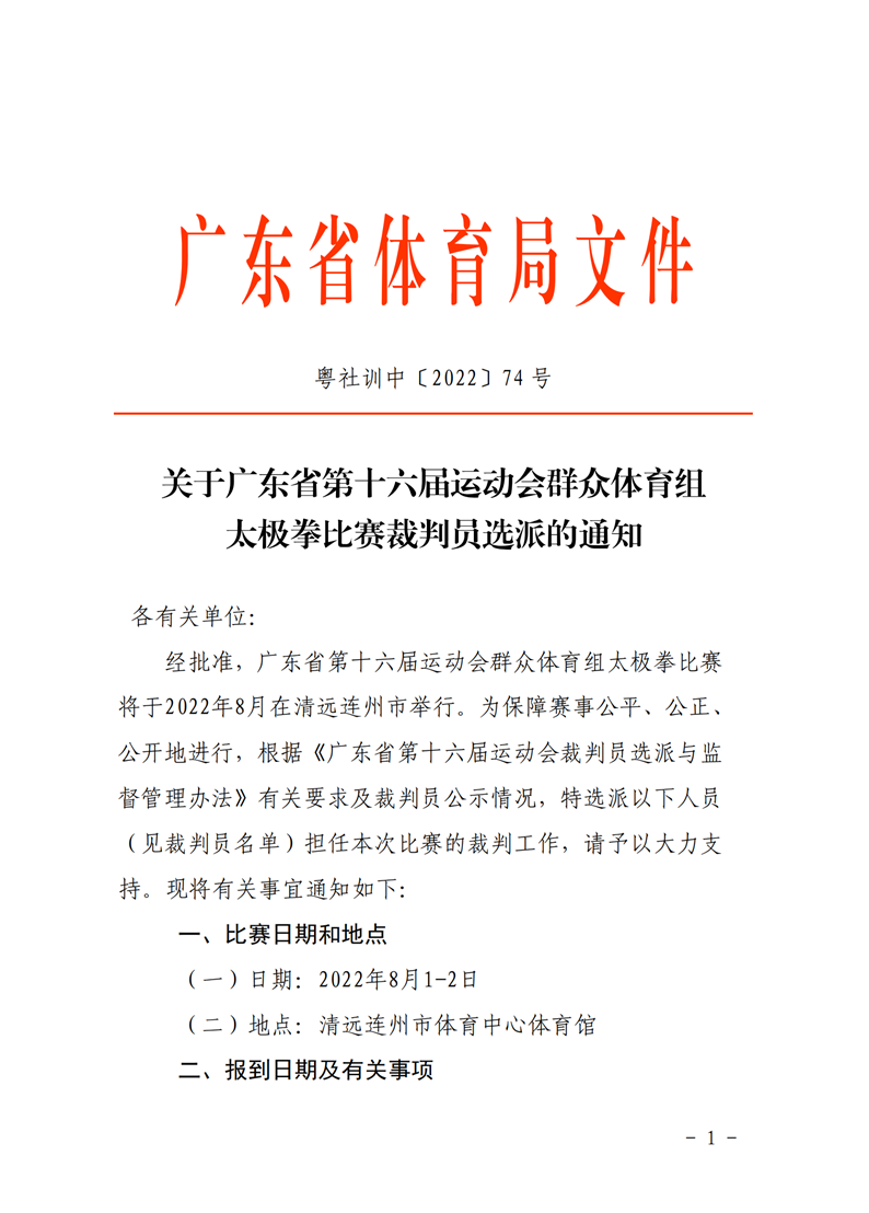 关于广东省第十六届运动会群众体育组太极拳比赛裁判员选派的通知 来源: 发布时间:2022-07-12 13:38:42 浏览次数: 次 【字体:小 大】 终审:吴旻龙 点赞 收藏 分享到: 【打印正文】