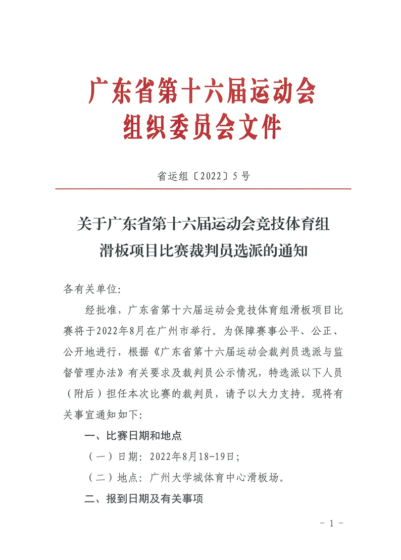 关于广东省第十六届运动会竞技体育组滑板项目比赛裁判员选派的通知 来源: 发布时间:2022-08-05 16:01:07 浏览次数: 次 【字体:小 大】 终审:社体部 点赞 收藏 分享到: 【打印正文】