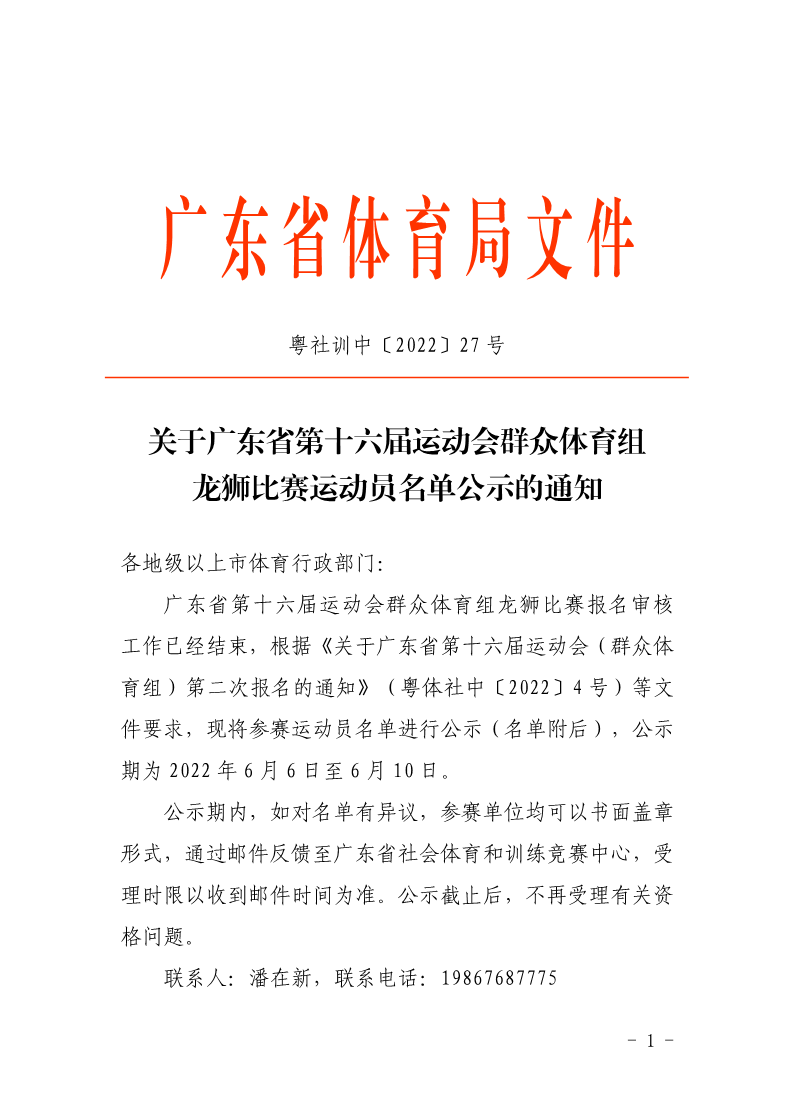 关于广东省第十六届运动会群众体育组龙狮比赛运动员名单公示的通知 来源: 发布时间:2022-06-06 16:24:00 浏览次数: 次 【字体:小 大】 终审:Admin 点赞 收藏 分享到: 【打印正文】
