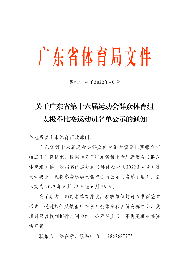关于广东省第十六届运动会群众体育组太极拳比赛运动员名单公示的通知 来源: 发布时间:2022-06-22 13:21:47 浏览次数: 次 【字体:小 大】 终审:吴旻龙 点赞 收藏 分享到: 【打印正文】