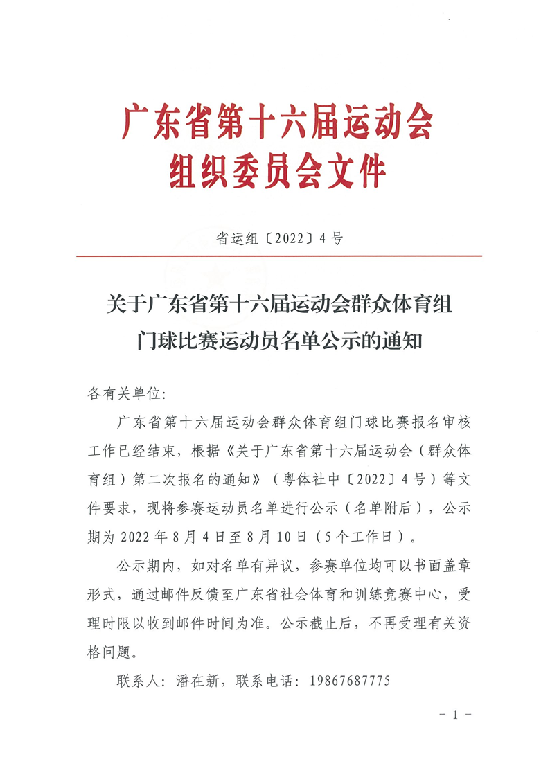 关于广东省第十六届运动会群众体育组门球比赛运动员名单公示的通知 来源: 发布时间:2022-08-05 15:59:22 浏览次数: 次 【字体:小 大】 终审:社体部 点赞 收藏 分享到: 【打印正文】